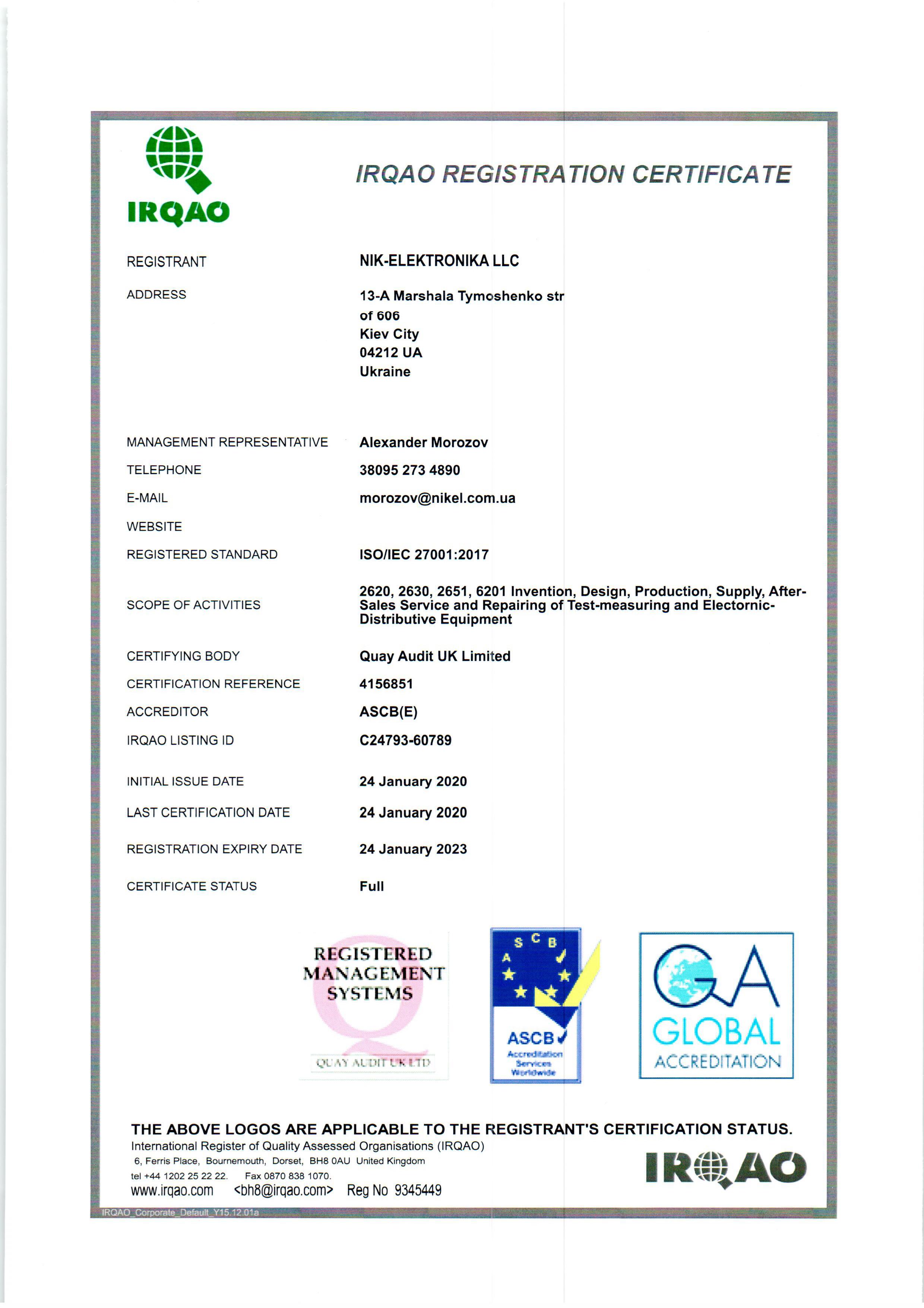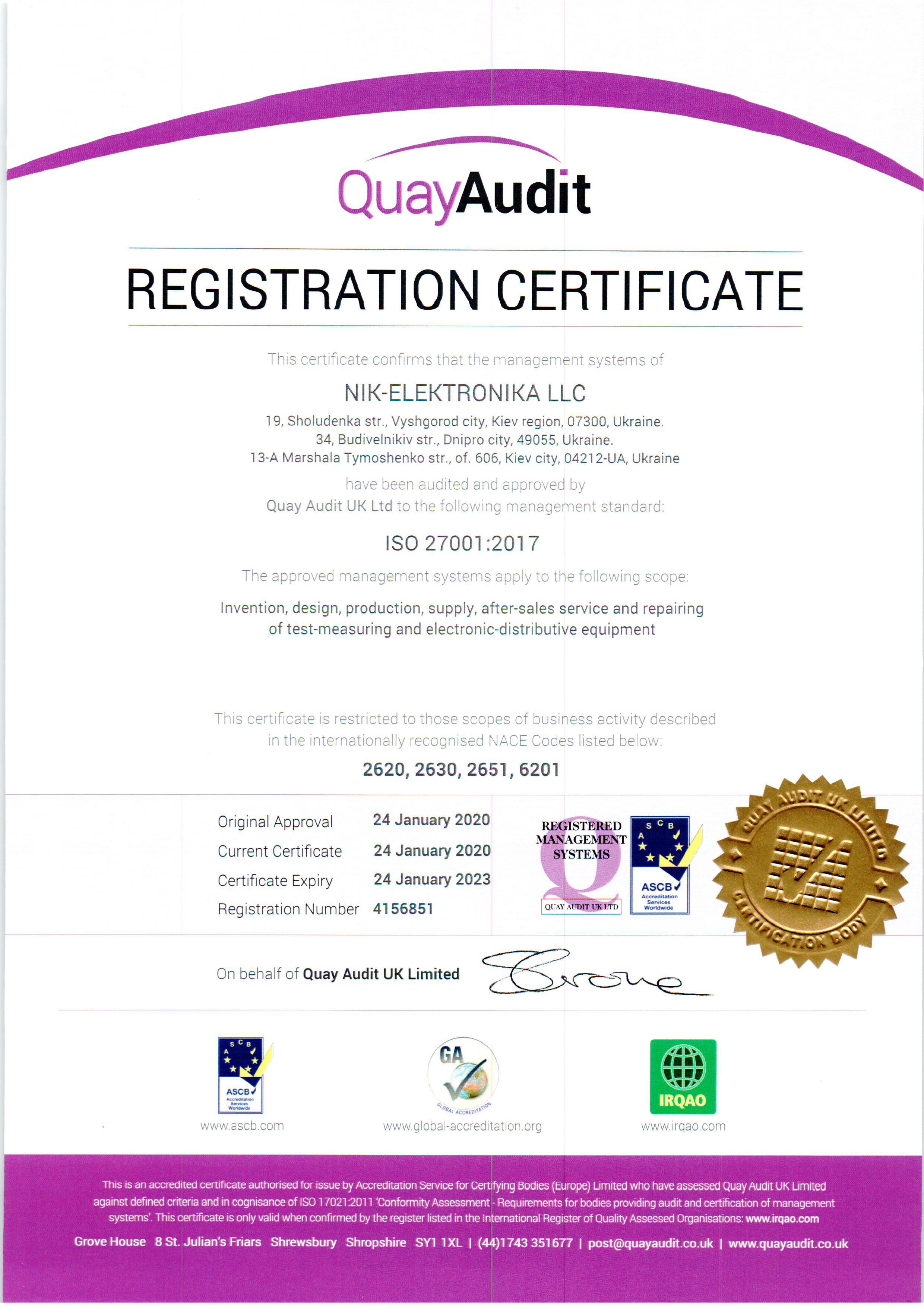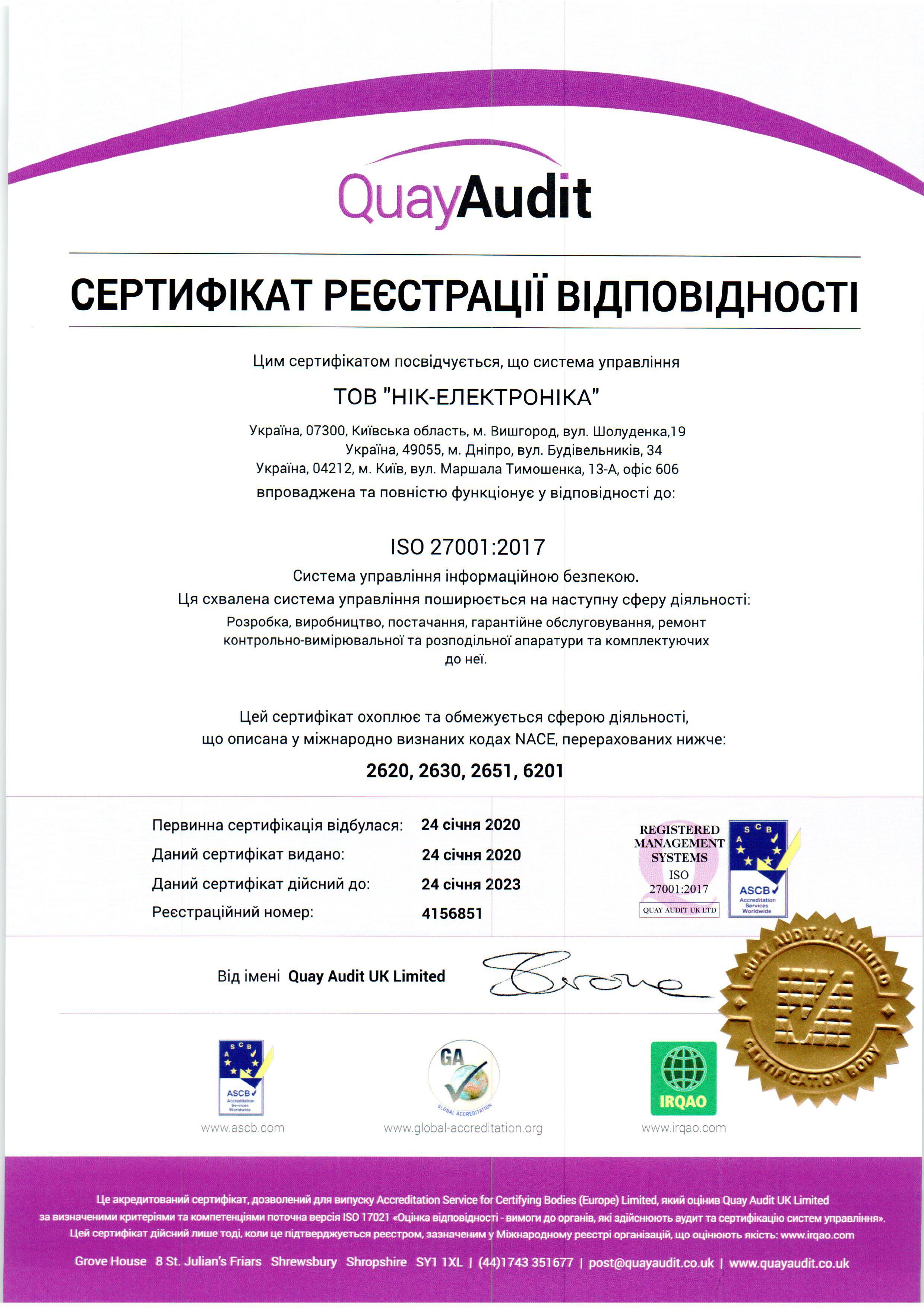 У січні 2020 року ТОВ «НІК-ЕЛЕКТРОНІКА» пройшло сертифікаційний аудит на відповідність системи управління підприємства вимогам стандарту ISO 27001:2017 «Система управління інформаційною безпекою». За результатом аудита орган з оцінки відповідності Quay Audit UK Limited видав сертифікат за №4156851.