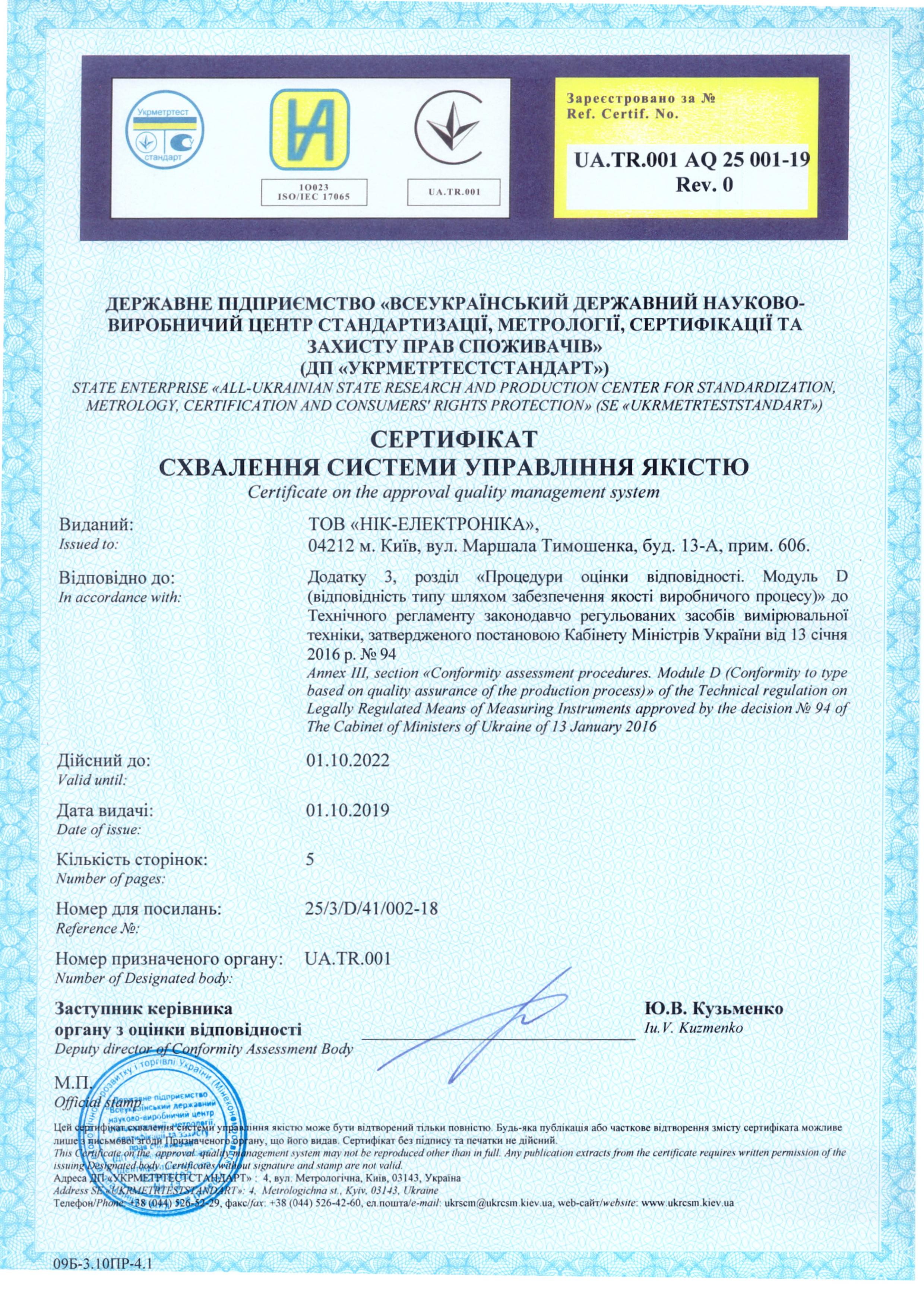 01.10.2019 року ТОВ «НІК-ЕЛЕКТРОНІКА» отримало Сертифікат схвалення системи управління якістю на відповідність вимогам Модуля D Технічного регламенту законодавчо регульованих засобів вимірювальної техніки, затвердженого постановою Кабінету Міністрів України від 13 січня 2016р. № 94.