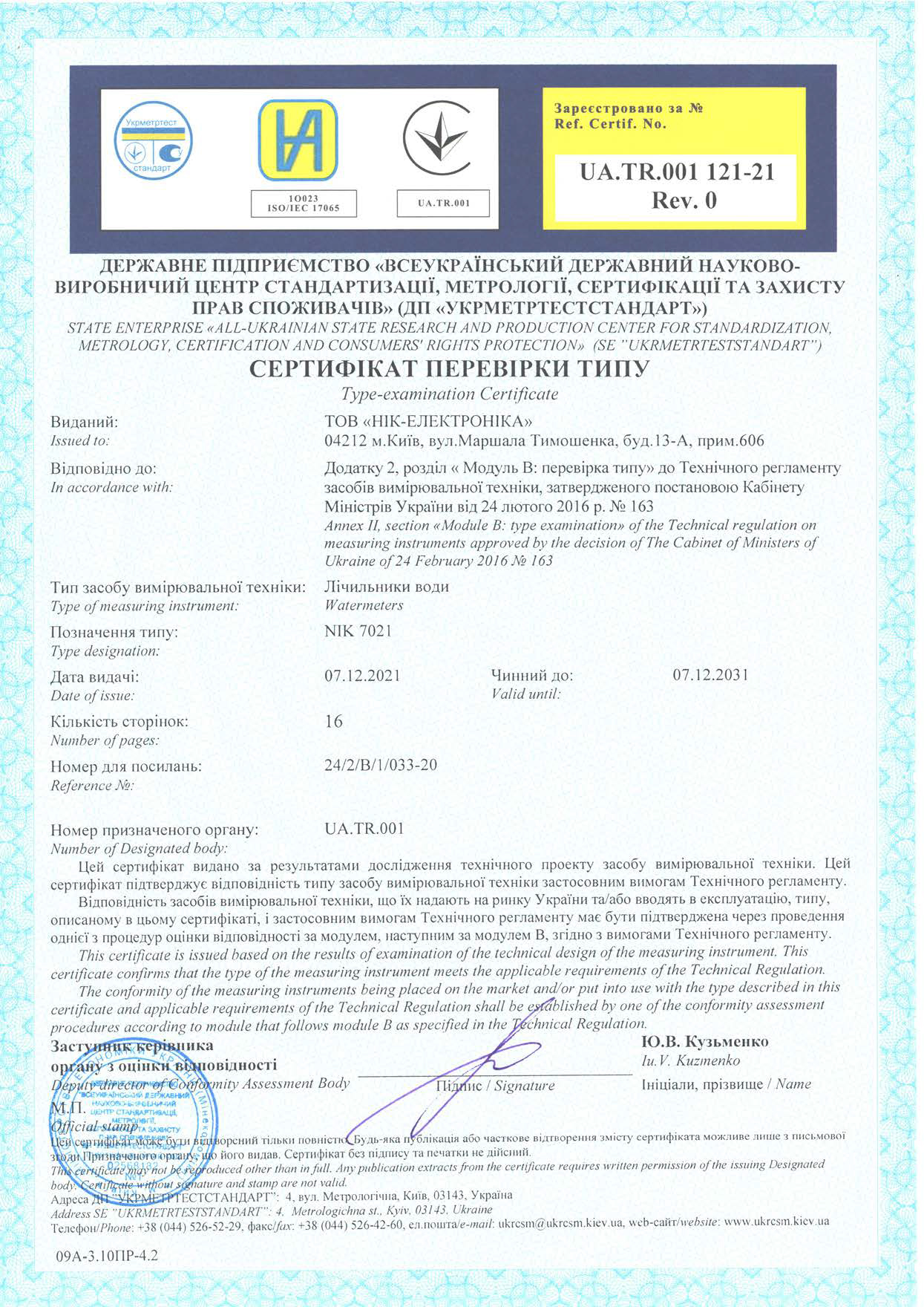 Лічильники типу NIK 7021 розробки ТОВ «НІК-ЕЛЕКТРОНІКА» пройшли випробування на відповідність технічному регламенту засобів вимірювальної техніки та було отримано сертифікат відповідності по модулю B лічильника води типу NIK 7021 №UA.TR.001 121-21 Rev.0