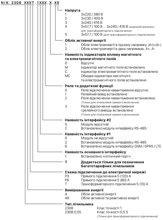 | Номінальна напруга | 3х220/380 В; 3х230/400 В; 3х240/416 В; 3х57,7/100 В (для трансформаторного підключення); 3х57,7/100 В ... 3х240/416 В (широкий діапазон для трансформаторного підключення) |